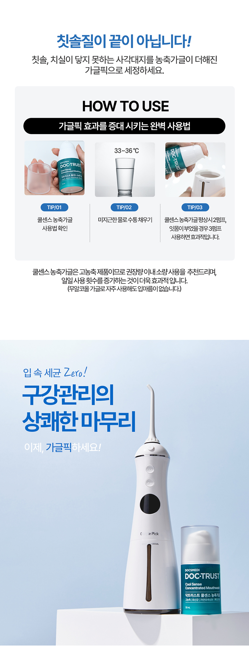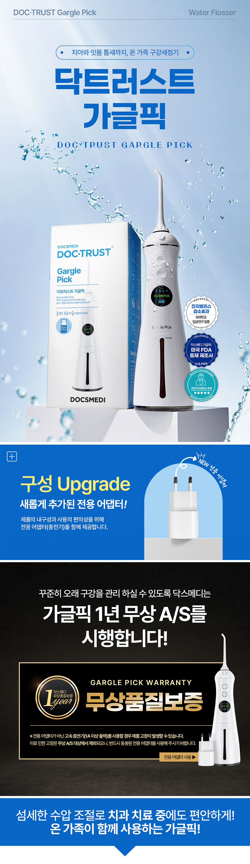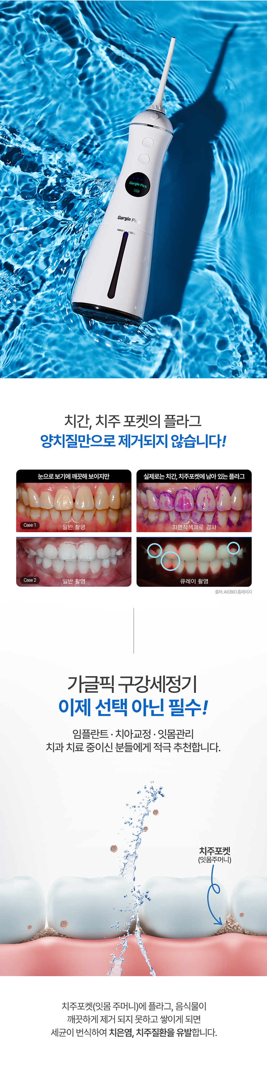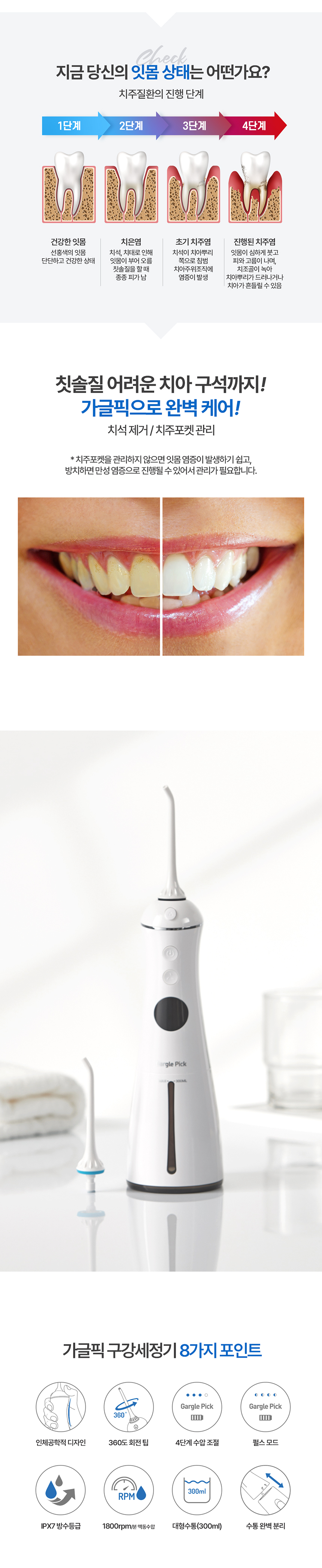 | 제품설명 | 치아 사이사이, 치주 포켓 사이사이, 잇몸 사이사이 물줄기로 쏴아~ 닦아주는 구강 세정기. | |