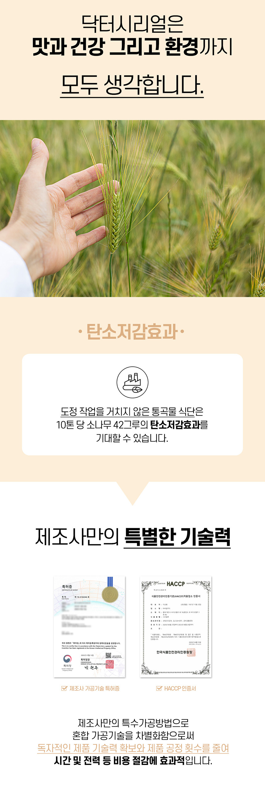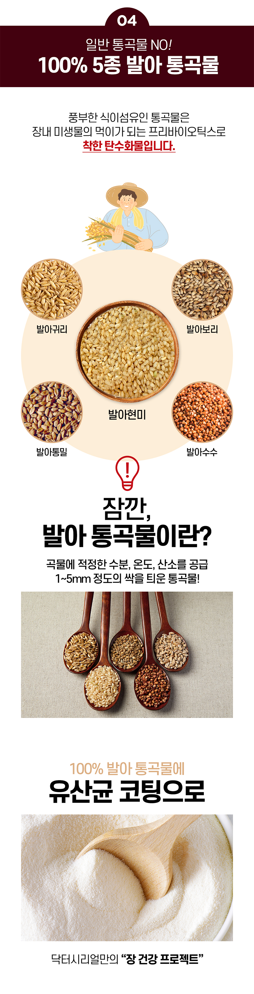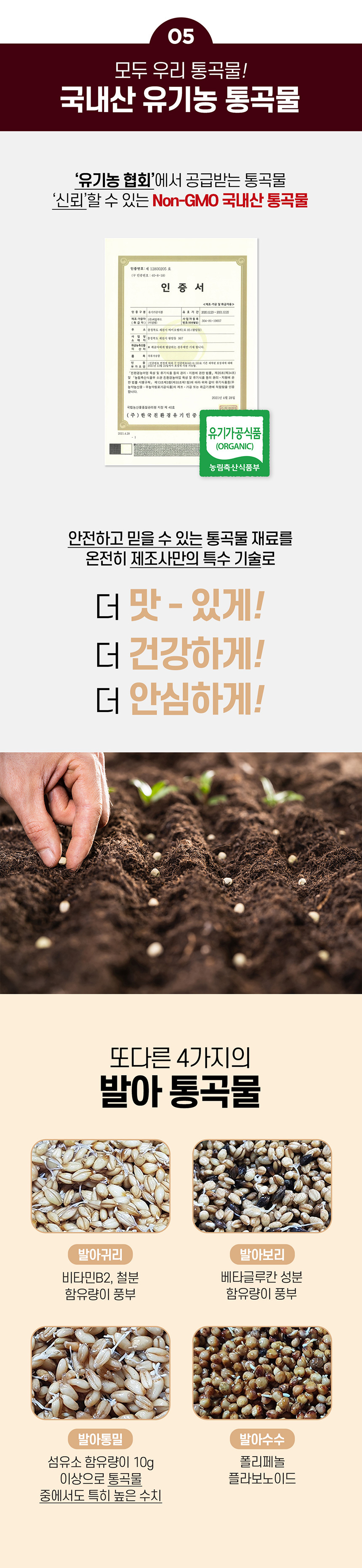 일반 통곡물이 아닌 100% 발아통곡물 5종(현미,보리,통밀,귀리,수수)가 주원료로 함유되어있고
