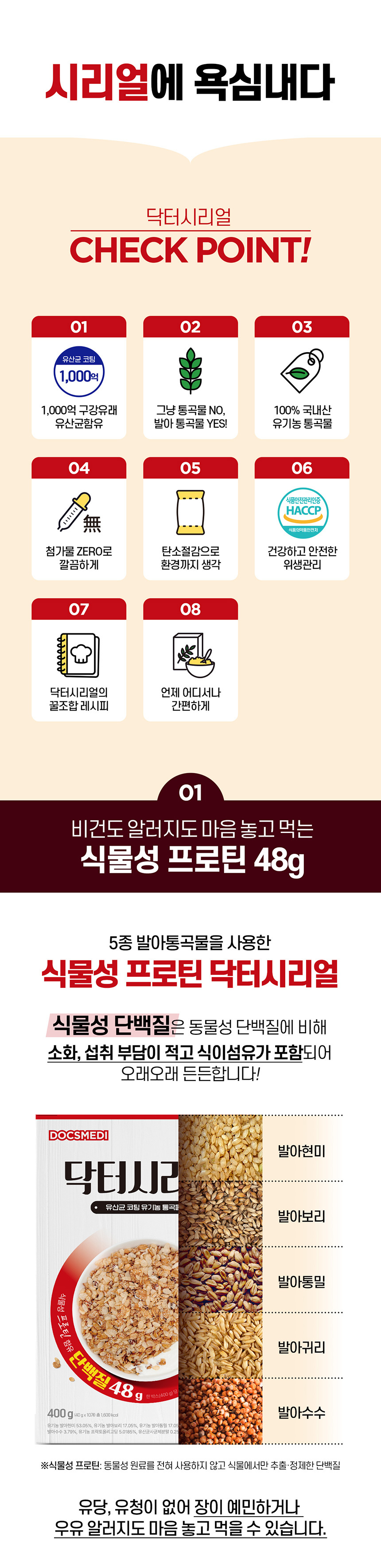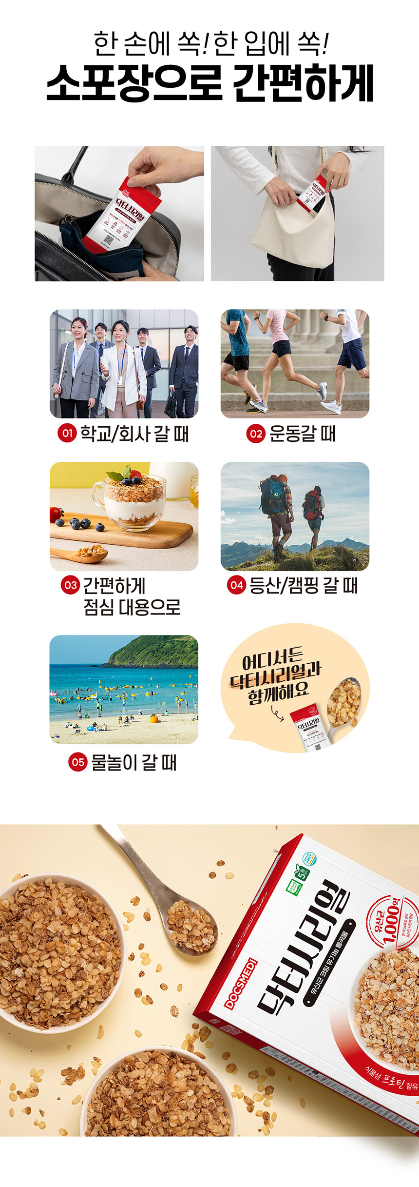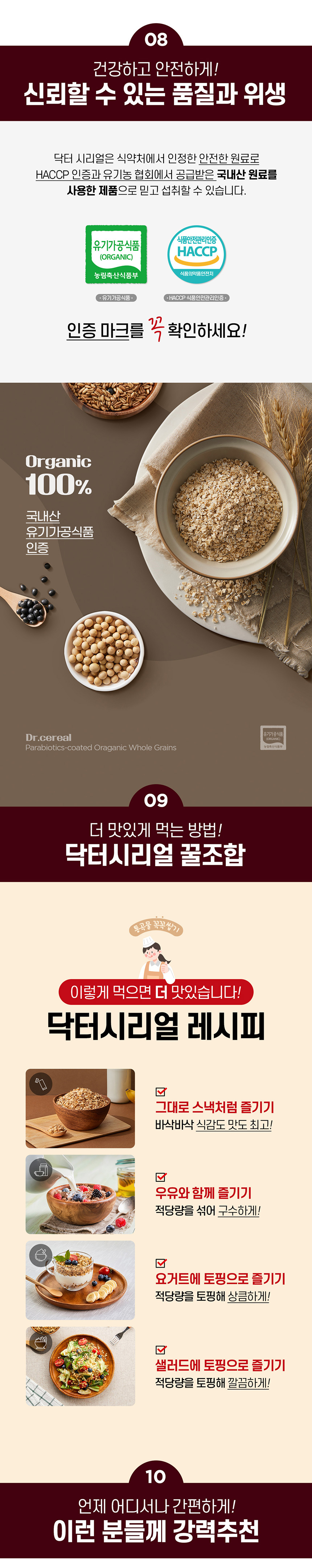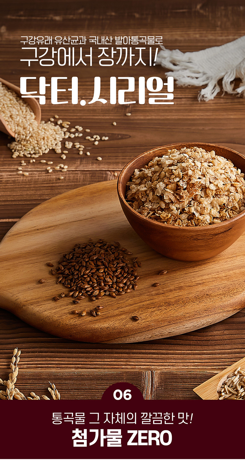 | 제품설명 | 구강 전문 기업에서 만든 시리얼. 유기농 발아 통곡물에 구강 유래 유산균 사균체 코팅으로 만든 건강한 시리얼 | |
