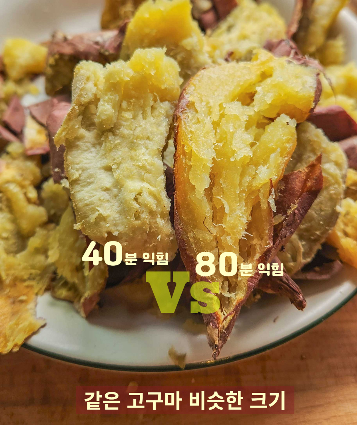 이렇게 살아 있는 고구마는 온도가 가해지면 고구마 전분이 당으로 바뀌는데 낮은 온도에서 오래 익혀야 충분히 바뀝니다. 급하게 익히면 전분이 바뀌기도 전에 익어 버리거나 타구요. 80도 미만에서 숙성시킨다 생각하고 40분 정도 익히고, 상태 체크하고 고온으로 한 번 더 익히는 게 좋습니다. 꺼내보고 상태에따라 한번더 돌려서 총 120분 정도 돌려도 좋습니다! 헌데 한번에 돌리고 방치하면 각 가정의 기기에 따라 성능과 환경이 달라 중간중간 체크하며 익히는게 제일 좋습니다!