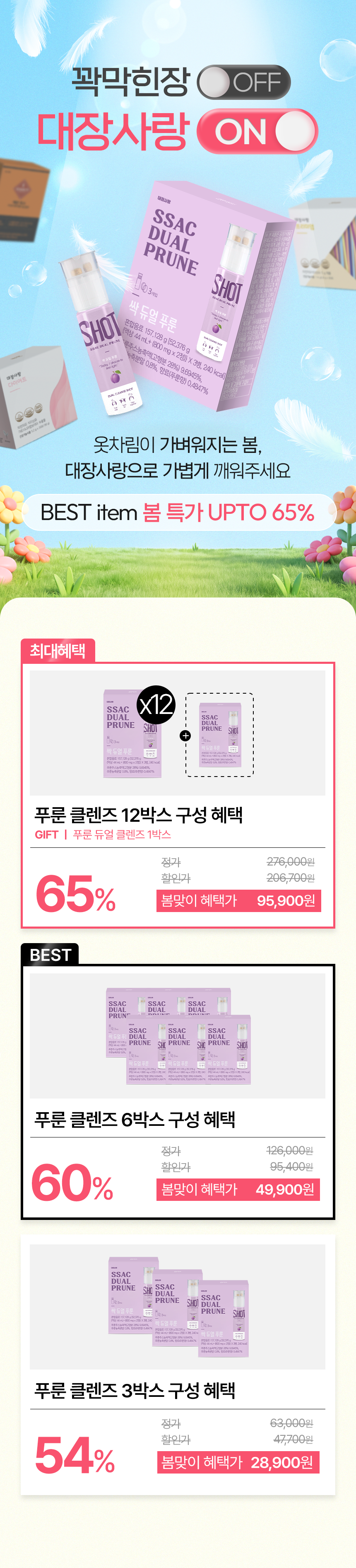 | 제품설명 | 정제로 한 번! 액상으로 두 번! 대장사랑 싹 듀얼 푸룬! | |