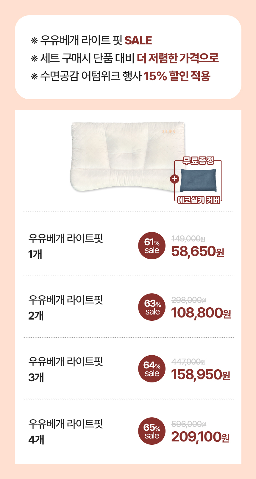다음은 NEW 우유베개 시리즈다. 약간 둥그런 탄탄하게 경추를 받쳐주는데, 종류에 따라 푹신한 정도가 다르더라. 살짝 다른 게 아니라 본인은 확연히 다르게 느껴졌다. 가장 탄탄한 듀오는 경추를 약간 마사지 해주는 기분도 느껴졌다.