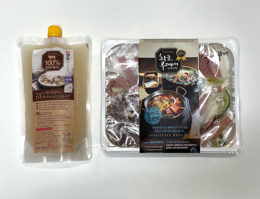 대량 생산이 아닌 주인장의 손에서 정성스럽게 만들어진 화로부대찌개는 이렇게 포장되어 고객들에게 전달된다. (한우 육수 포함!)