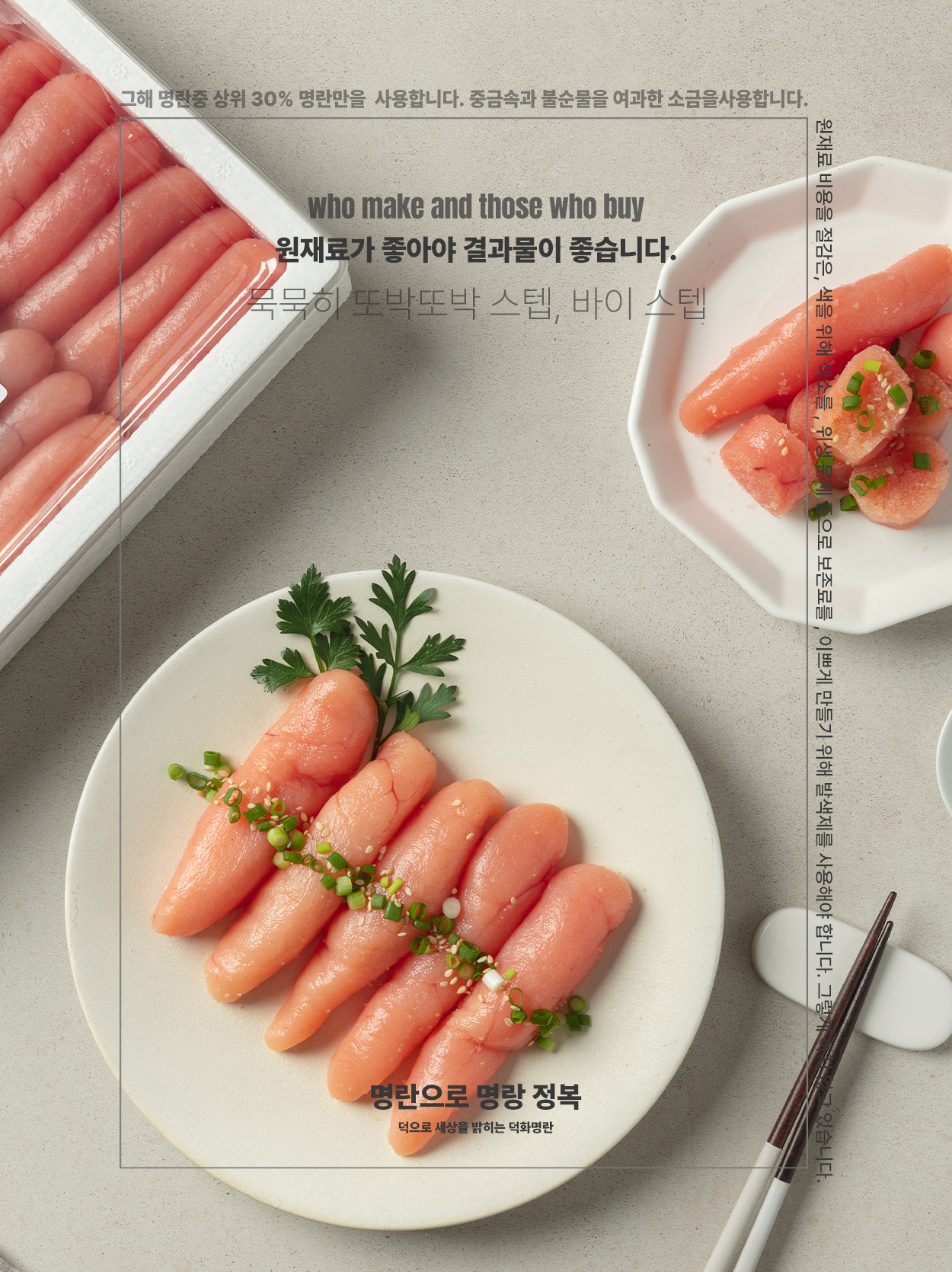 백명란은 소금으로만 절인 제품이고 그때 그대로 명란은 국내산 청주에 절인 명란, 숙성고에서 갓 꺼내먹는 명란은 제주 전통 어간장과 고춧가루를 이용해 김치처럼 무친 명란이다. 색소를 전혀 넣지 않고 만들기 때문에 색 차이는 양념의 차이라고 보시면 되겠다.