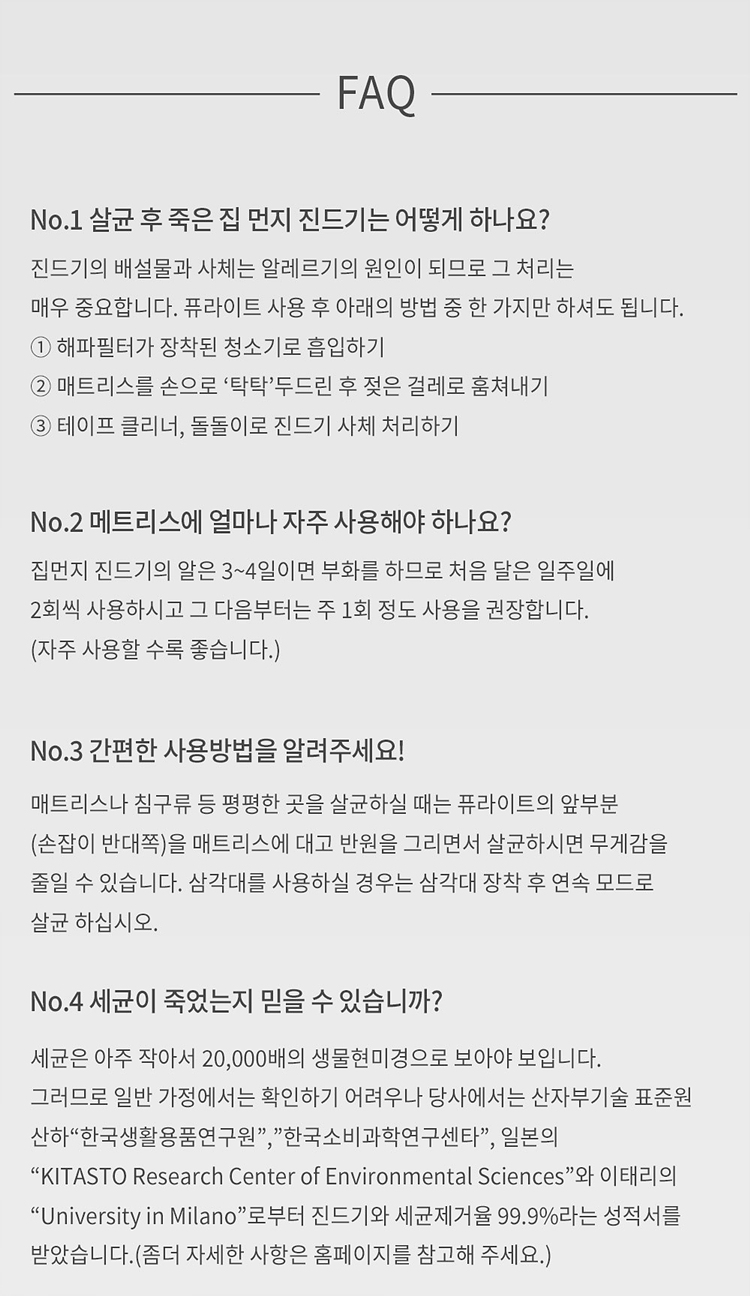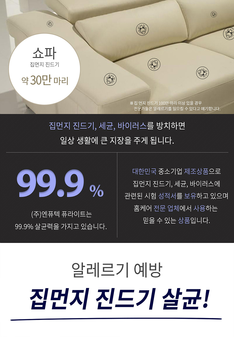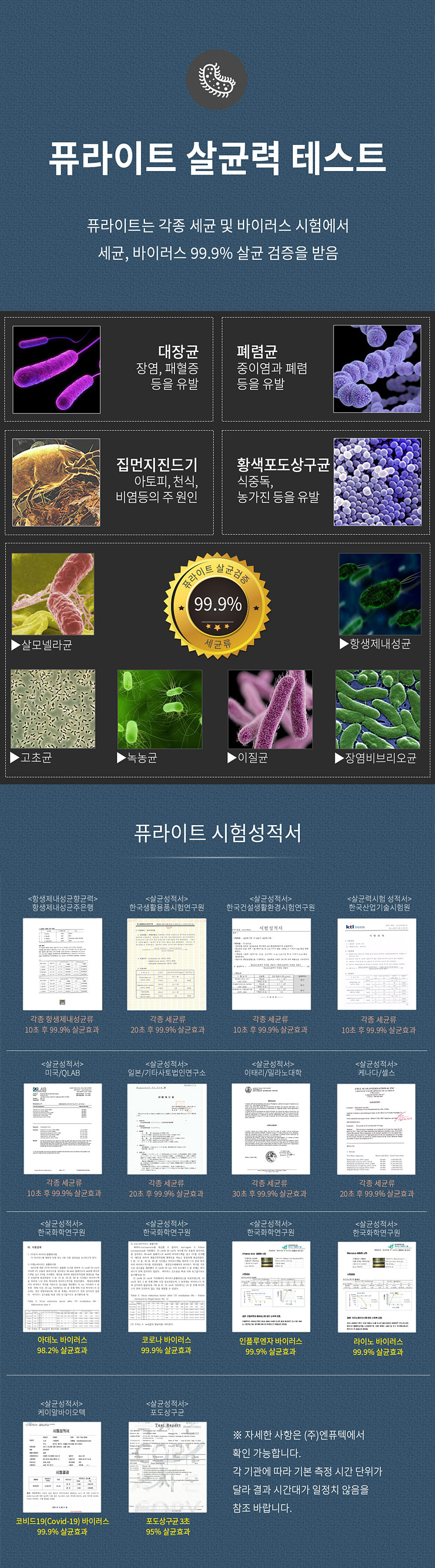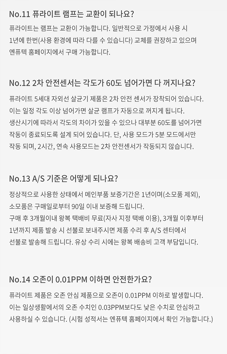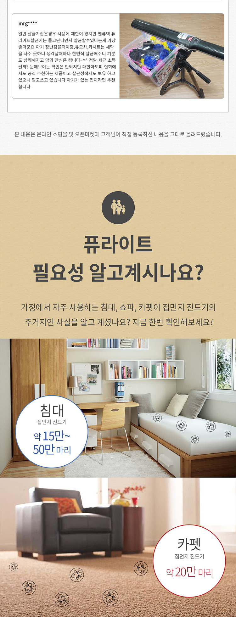 엔퓨텍은 퓨라이트가 세균 뿐만 아니라 집먼지 진드기 등에도 효과가 있음을 강조하고 있다. 진드기는 가시광선을 싫어하기 때문에 살균 램프를 쬐어주면 도망가는 녀석들도 있다 한다.