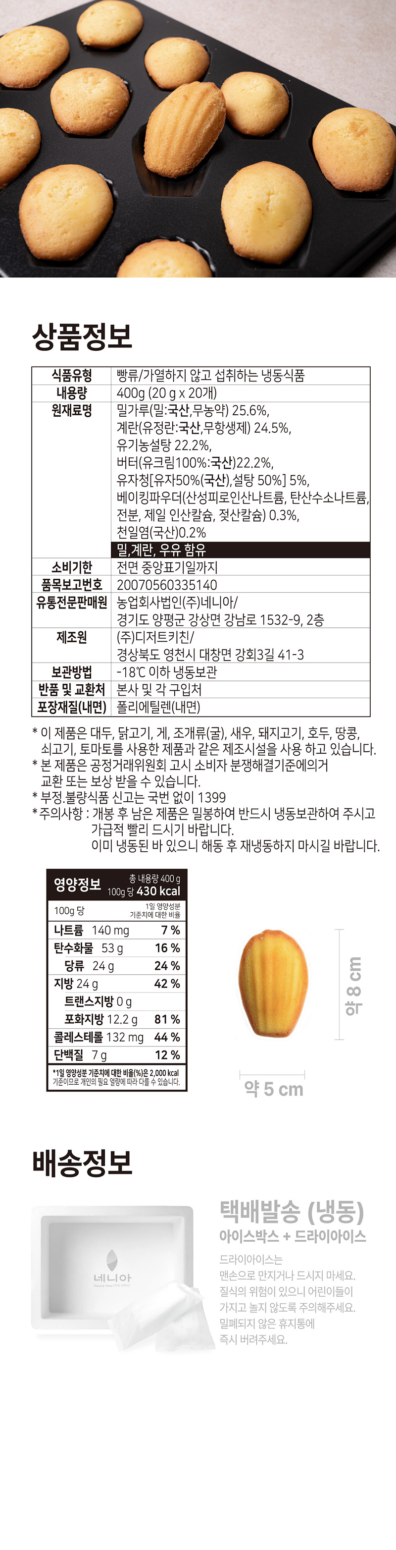 디저트 원정대 귀여운 빵들이 어떻게 만들어지는 확인하지 위해 경북 영천으로 달려갔다. KTX를 타고 동대구역에 도착해 차 타고 약 40분을 더 들어가면 이번 취재 장소를 찾을 수 있다. 네니아 베이커리를 만드는 디저트 키친의 시작은 학교에서부터 시작됐다. 지금의 대표님이 학교에서 근무하실 당시 학교에서 제빵과 참기름 관련 창업을 제안받고 시작하신 게 계기가 돼 지금까지 이르렀다. 공장의 규모는 그리 크지 않지만 해썹 인증까지 받은 만큼 입장 전 위생복 착용을 철저히 했다. 입장하면 바로 옆에 네니아 우리밀로 만든 밀가루와 국산 무항생제 계란들을 볼 수 있었다. 취재를 진행했을 당시에는 시몬 카스테라를 생산하고 있었다. 아래층에서 제빵 과정을 거쳐 빵이 완성되면 2층으로 이동해 외형에 문제가 없는지 확인하고 부수적인 가루들을 털어주는 등의 검수과정을 거친 후 기계를 이용해 포장까지 완료한다. 우리밀 지금부터 우리밀에 대한 이야기를 잠깐 할 건데 그전에 먼저 빵이 어떻게 만들어지는가를 간단히 설명해 보려 한다. 빵을 만들기 위해선 밀가루, 베이킹 소다, 천연 버터, 올리브유, 유정란, 소금, 물 등이 필요하다. 위 재료들을 만드는 빵의 종류에 따라 성분, 비율을 정해 반죽을 진행한 후 발효, 숙성 과정을 거쳐 굽는다. 밀가루는 크게 단백질과 전분으로 나눌 수 있다. 단백질은 글루텐을 형성하고 이는 빵이 부풀 수 있는 뼈대 역할을 한다. 전분은 일부는 이스트의 영양원이 되고, 나머지 대부분은 물을 흡수하면서 글루텐 조직이 만든 그물망 사이를 메워 글루텐과 함께 빵의 골격을 이룬다. 우리밀의 글루텐 함량은 수입밀에 비하면 수치가 떨어진다. 제빵에 적절한 글루텐 함량은 11%에서 13% 정도지만 우리밀 중 가장 글루텐 함량이 높은 종은 10% 정도다. 이렇게 차이가 나는 이유는 밀의 품종, 기후, 재배 환경 등 여러 가지가 있다. 하지만 최근에 우리나라의 제분기술이 향상되고 우리밀의 제빵 적성이 좋아져서 빵을 만드는데 큰 문제는 없다고 한다. 여기서 제분이란 밀을 밀가루로 만드는 작업을 말한다. 게다가 우리밀은 겨울밀이기 때문에 농약의 사용도 적고 수입밀에 비해 유통 과정이 짧아 밀의 신선도가 좋고 친환경적인 먹거리라고 할 수 있다. 요즘엔 인터넷에서 우리밀로 만든 빵을 쉽게 찾을 수 있다. 그러나 우리밀의 자급률이 1% 정도로 아주 적어 가격이 상대적으로 비싸고, 예전의 제빵 적성이 좋지 않다는 인식이 남아 지금도 점유율은 많이 떨어지는 것이 현실이다. 우리밀은 수입밀에 비해 단백질 함량은 다소 낮으나 부드럽고 밀도 있는 식감을 가진 빵을 만들 수 있다. 냉동빵과의 첫 만남 냉동빵은 이미 시중에 많지만 개인적으로 이전까지 먹어본 경험이 없었다. 빵이 먹고 싶을 땐 그냥 동네 빵집에서 그때그때 사서 먹었지 냉동빵을 사서 집에 두고 먹을 일이 없었다. 그렇기에 처음엔 냉동빵에 대한 약간의 불신이 있었지만 나의 첫 경험은 너무나도 성공적이었다. 냉동상태에서 아무것도 하지 않고 여유롭게 한 시간 정도 해동만 진행한 후 먹어본 네니아 베이커리는 굉장히 폭신하고 부드러웠다. 해동만 잘하면 남부럽지 않은 퀄리티가 나와 정말 맛있게 시식했다. 어느 정도 해동한 후에 전자레인지에 살짝 돌려먹으면 보다 따뜻한 빵을 만나볼 수 있다. 다만 전자레인지를 이용하면 아무래도 빵이 건조해지기 때문에 만약 집에 에어프라이기나 오븐이 있는 분들은 이를 이용하시면 더 맛있게 드실 수 있다. 이렇게 모양이 세밀하게 있는 빵의 경우 처음에 찍어내고 다음 빵을 찍을 때 빵 찌꺼기가 조금만 남아있어도 모양이 망가져 찍어낼 때마다 틀을 털어주고 기름을 발라내는 작업을 해야 한다. 공이 많이 들어가는 만큼 귀엽다. 간편하지만 무게감 있게 최근 냉동식품들의 퀄리티가 많이 좋아졌다고 하지만 그래도 직접 식당에 가서 먹는 음식과는 차이가 있다는 게 일반적인 인식이다. 네니아 베이커리 역시 정말 맛있는 빵집의 갓 구운 빵과 비교하면 어느 정도 한계는 있다. 하지만 냉동식품 중에서도 질 좋은 것들은 일반적인 식당과 견주어도 밀리지 않은 맛을 보여줄 때가 있다. 네니아 베이커리가 그렇다. 우리밀로 만든 밀가루와 국산 무항생제 유정란 사용을 고집하기에 믿고 먹을 수 있다는 점 또한 장점이다. 게다가 레몬버터 곰마들렌과 초코버터 곰마들렌, 구운 핫도그에는 동물복지 무항생제 유정란을 사용한다. 비교적 자유롭고 질 좋은 사육장에서 건강하게 자란 닭의 유정란으로 만들어진 빵이니 건강한 소비라고 할 수 있겠다. 그렇기에 현재 초등학교에 급식으로도 네니아 베이커리를 납품하고 있다. 귀여운 곰마들렌 제품이 탄생한 이유도 아이들에게 식사 시간에 조금이나마 즐거움을 주기 위해서라고 한다. 맛 좋고 건강하며 관리도 편리한 네니아 베이커리 시리즈. 모양까지 귀여우니 추천하지 않을 이유가 없다.