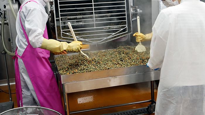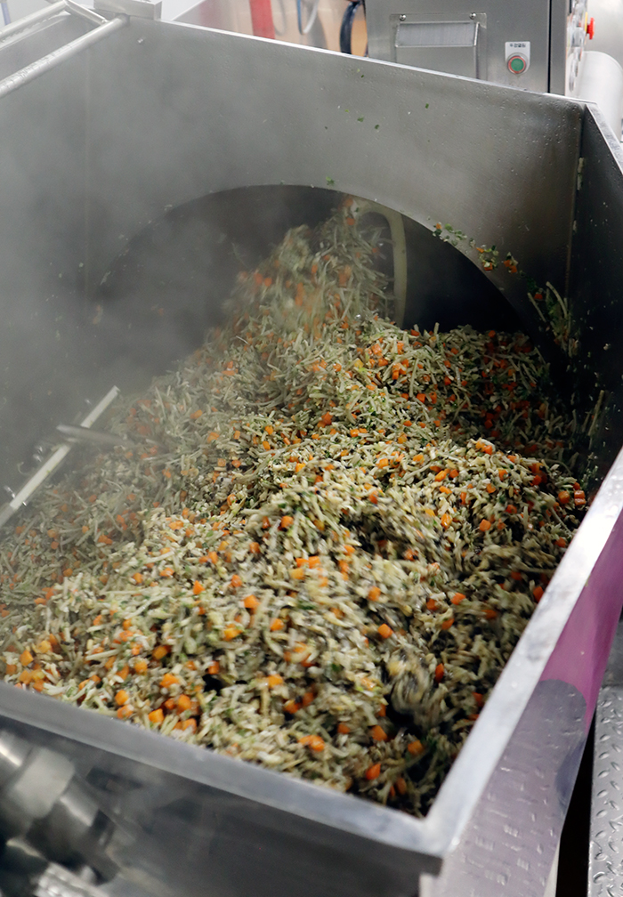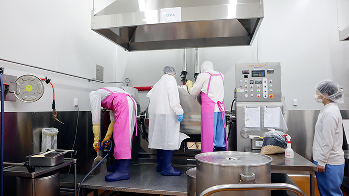 오랜 시간 가열을 통해 1차 조리가 완료된 원물들을 소스와 혼합 포장을 하기 위해 이동된다.