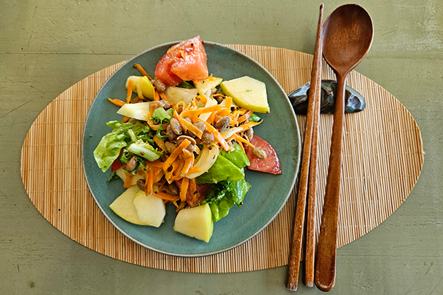 샐러드에는 올리브유와 식초를 넣고 시간과 간장으로 간을 했다.