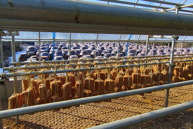 황토방에서 온도를 올려 숙성시키고 야외에서 바람을 맞으며 건조도 하고 염분이 높은 소금물에 담그기도 하면서 우량의 미생물만이 남아 더 좋은 장이 만들어진다.