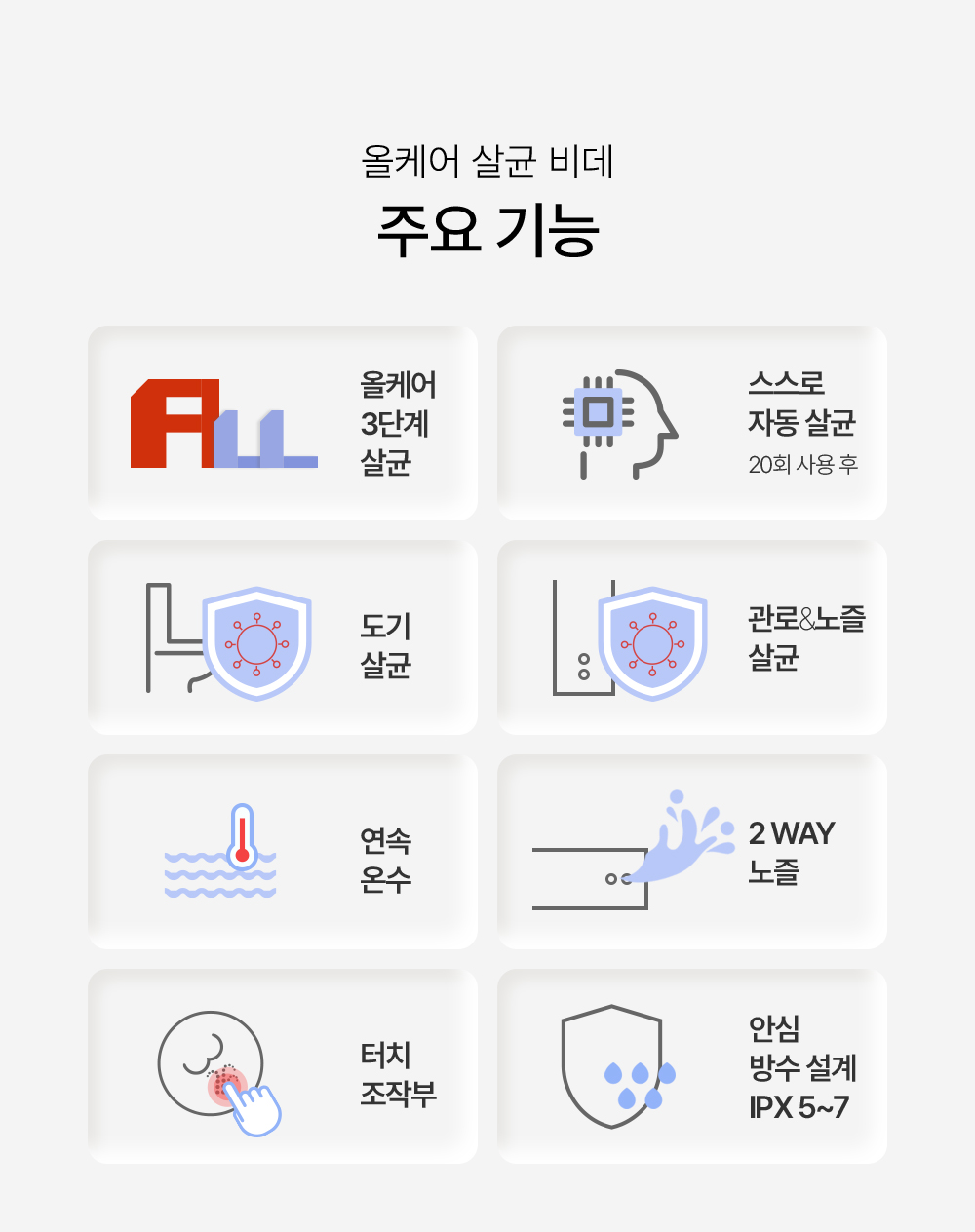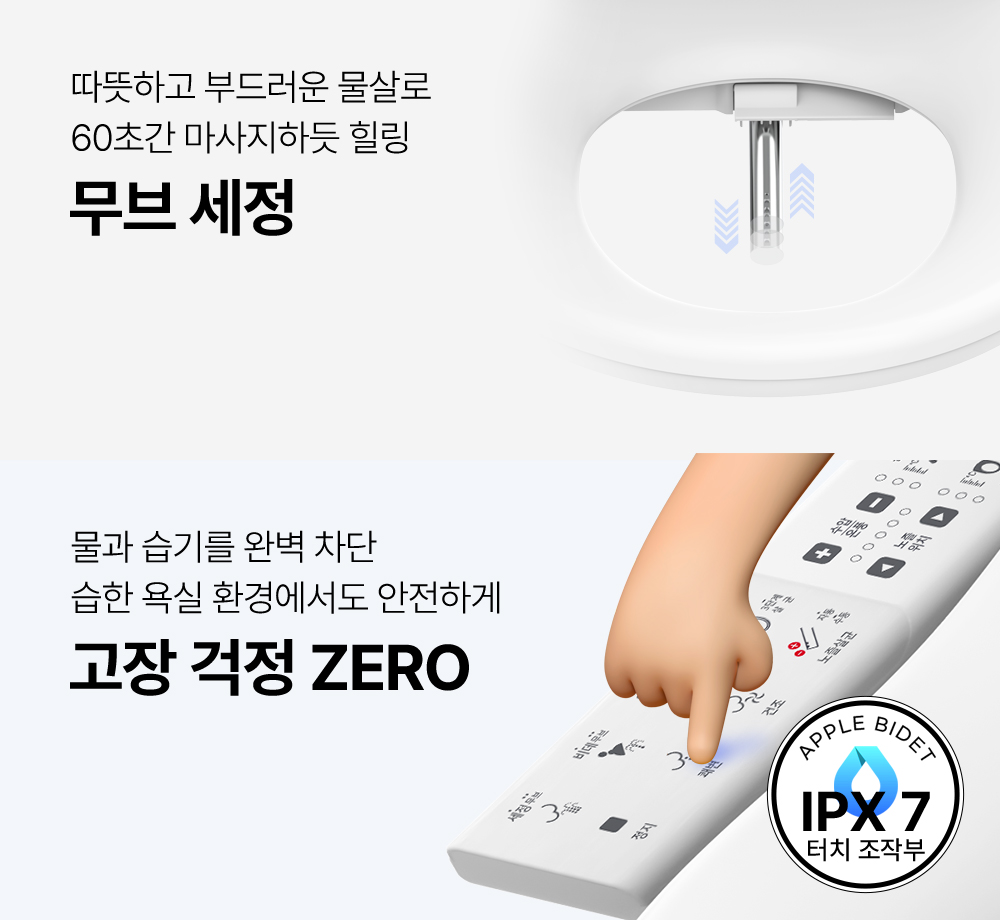 전기 분해를 통해 수돗물을 살균수로 만들어 비데 관리에 사용하는 것은 사실 꽤 익숙한 기술이다. 그래서 올케어 살균 비데의 출시가 늦은 감이 있는 만큼 애플젠에서는 고민한 흔적이 보인다. 노즐, 관로 살균은 기본이고 미스트 형태로 도기에 뿌려주는 기능에 노즐, 관로, 도기 살균까지 한 번에 끝내주는 3단계 자동 살균 기능, 20회 사용 시마다 살균을 해주는 스스로 자동살균 기능까지 꼼꼼히 집어 넣었다.
