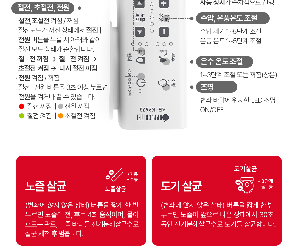 | 제품설명 | 노즐, 관로, 도기까지 터치 한 번으로 AB-K9673 | |