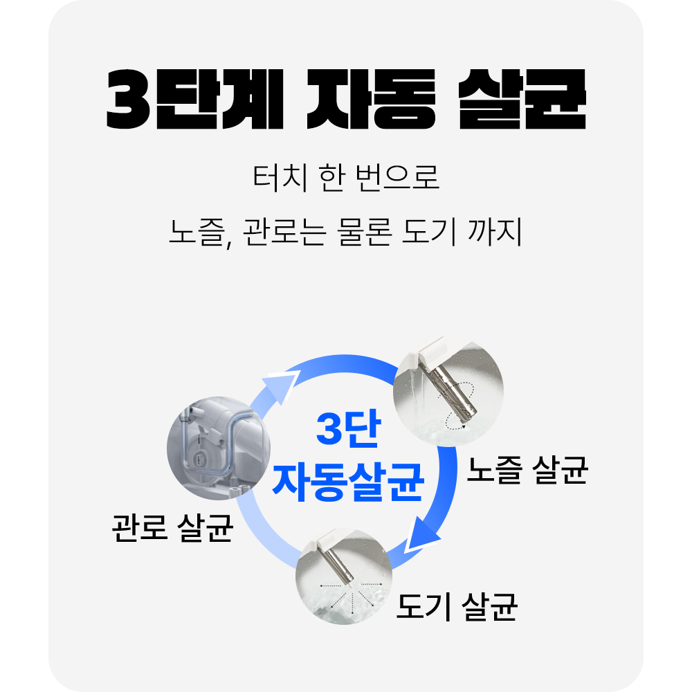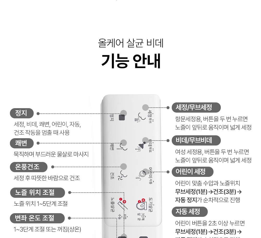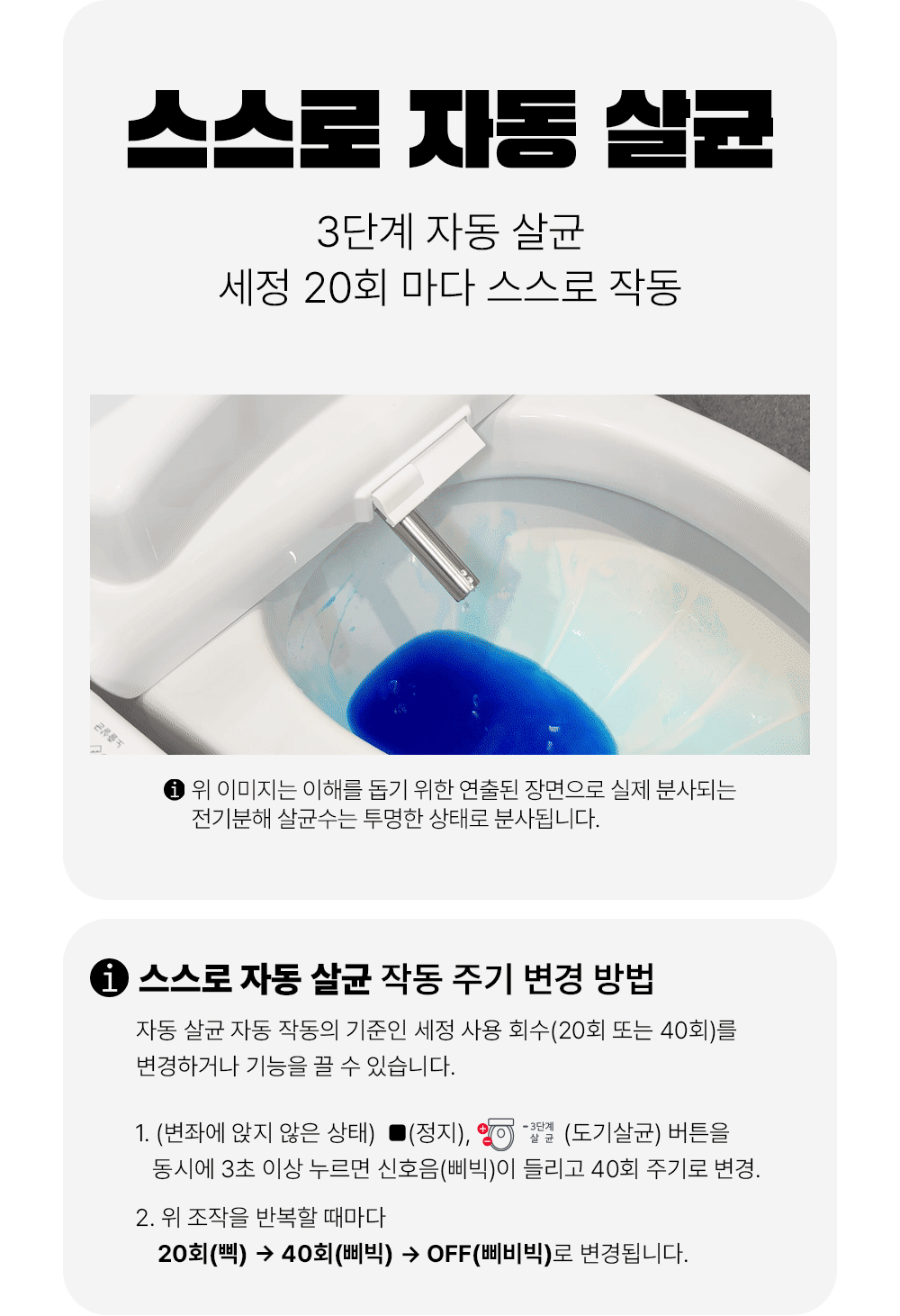 이상의 조작들을 짧게 누르는 것은 사용자가 살균수로 헹궈줄 필요성을 느낄 때에만 하면 된다. 노즐 살균 버튼을 길게 누르면 자동 살균 설정이 되어 사용 20회마다 알아서 살균 동작을 수행해준다.