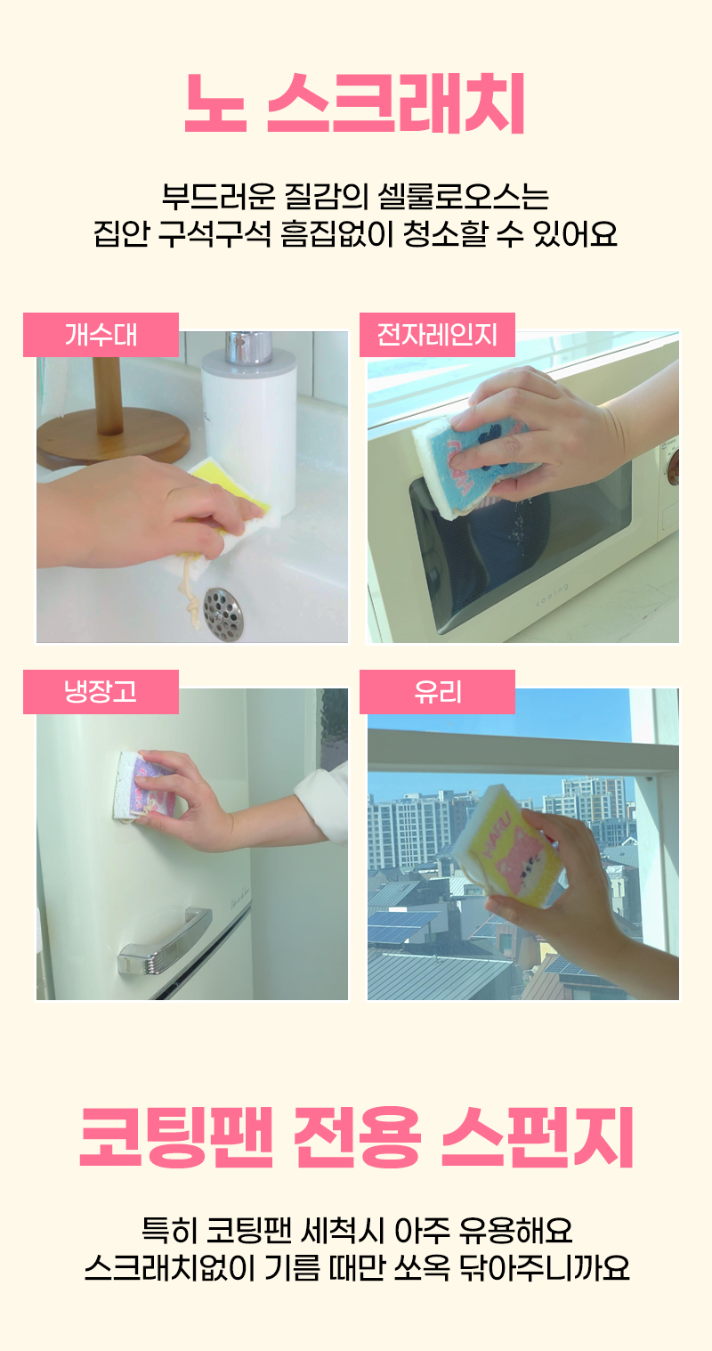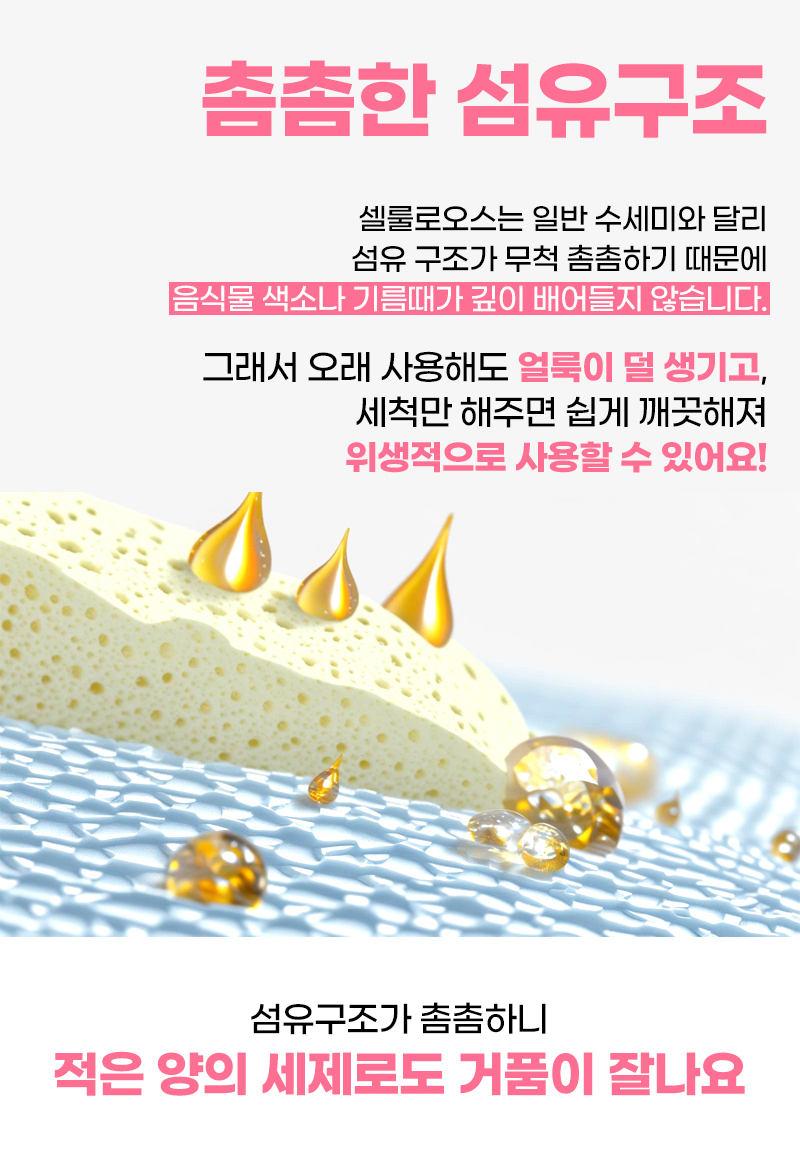 어차피 탄 자국같이 거칠게 닦아야 하는 것들은 따로 철 수세미 같은 제품을 이용하는 편이라 이 부드러움이 나에겐 단점이 아니었지만 일반적인 수세미도 단단한 제품을 선호하는 분들에게는 약간은 단점이라고 할 수 있을 정도의 부드러운 느낌이다.