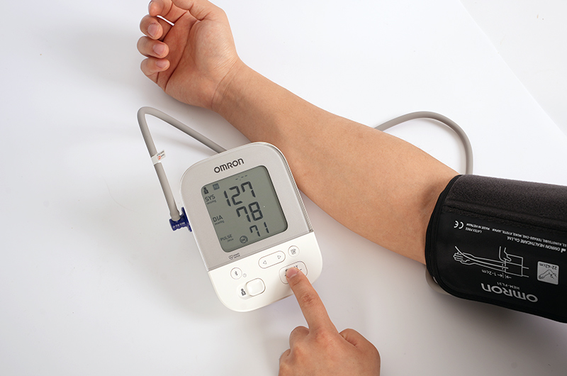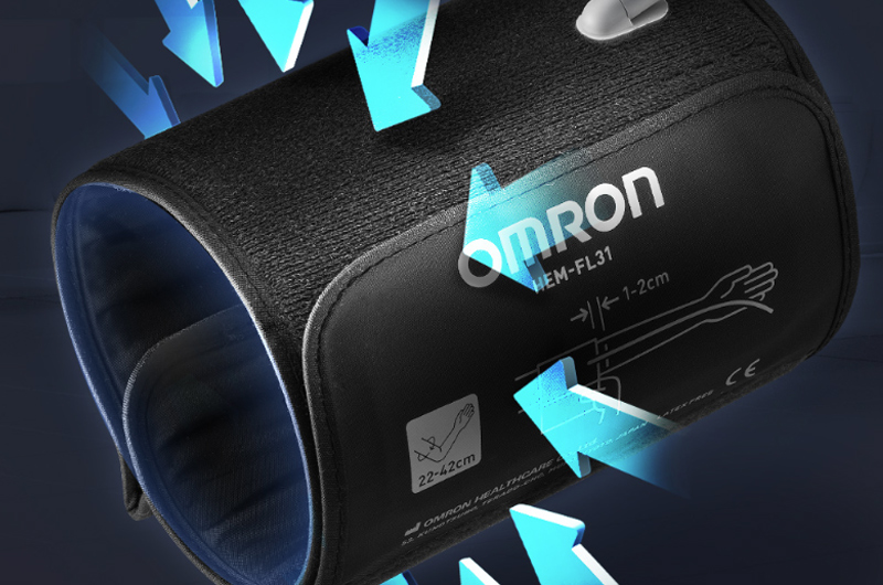 (오므론 혈압계는 정확한 혈압측정을 위해 상완에 두르고 가압하여 자동으로 수축 및 팽창 작용을 한다.)